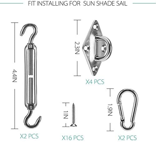 Quantity: the shade sail hardware kit includes Turnbuckle (2pcs), Pad eye (4pcs), Carabineer/hook (2pc), Screws (16pcs)